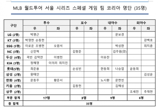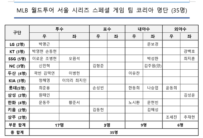 이에 따라 '팀 코리아' 최종 명단 35인은 투수 17명, 포수 3명, 내야수 9명, 외야수 6명으로 구성됐다. 구단별로는 SSG와 롯데가 5명으로 가장 많고, 두산, 한화가 4명, KT, NC, KIA가 3명, LG, 삼성, 키움, 상무가 각각 2명씩 포함됐다.