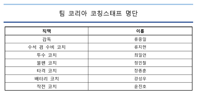 한편 KBO와 전력강화위원회는 지난달 선임된 류중일 팀 코리아 감독과 함께 MLB 월드투어 서울 시리즈 스페셜 게임을 지휘할 코칭스태프를 확정했다. 수석 겸 수비 코치에 류지현, 투수 코치 최일언, 불펜 코치 정민철, 타격 코치 장종훈, 배터리 코치 강성우, 작전 코치 윤진호가 선임됐다.