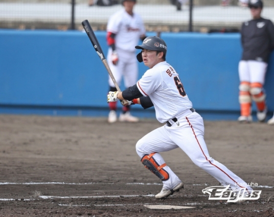 일본 오키나와 연습경기에서 타구를 날리고 있는 문현빈. /사진=한화 이글스