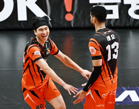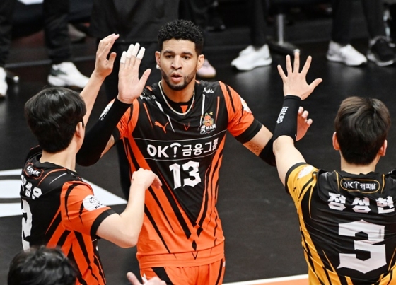 안산 OK금융그룹이 플레이오프(PO) 직행에 한 발짝 더 다가갔다. 올 시즌 상대전적에서 1승 4패로 밀리던 인천 대한항공을 상대로 만들어낸 승리라 더욱 짜릿했다.