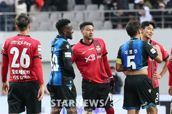 FC서울 린가드가 경기 종료 후 인천 음포쿠와 인사를 나누고 있다.