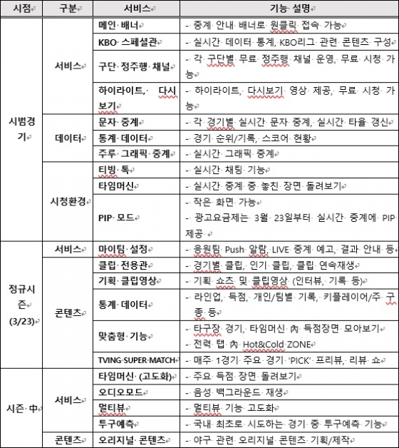 키워드만 봤을 때 특별한 내용은 없었다. 득점 장면 모아보기, 놓친 장면 둘러보기 등으로 보도자료를 통해 "스포츠는 물론 콘서트까지 티빙을 생중계 맛집으로 자리매김하게 했다"는 포장한 타임머신 기능은 기존 플랫폼에서도 '뒤로 가기' 혹은 득점 장면 클립을 통해 볼 수 있던 것이었다. 동시에 다양한 경기를 볼 수 있는 멀티뷰 기능과 구단별 응원방 등도 성능의 차이가 있을 뿐 기존 플랫폼들에도 있던 개념이다. 그나마 음성만 제공하는 오디오모드나 투구예측 시스템 등이 차별화됐으나, 개막전까지 보기 어렵다.