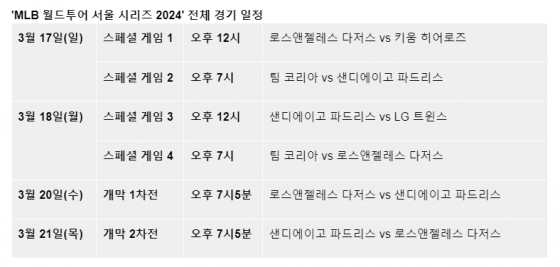 'MLB 월드투어 서울 시리즈 2024'는 4차례 스페셜 게임과 메이저리그 LA 다저스-샌디에이고 파드리스의 정규시즌 개막 2연전으로 구성된다. 17일 다저스-키움, 팀 코리아-샌디에이고전, 18일 샌디에이고-LG, 팀 코리아-다저스전 등 스페셜 게임에 이어 20, 21일 이틀간 다저스-샌디에이고의 경기가 치러진다.