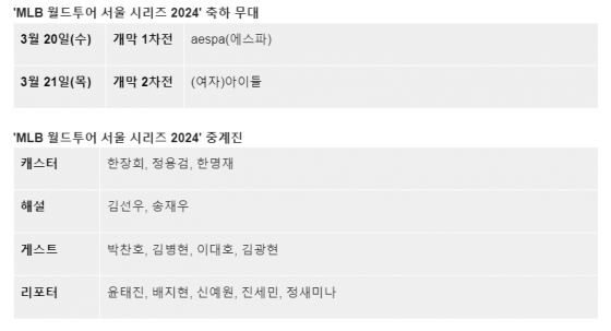 사상 최초로 한국에서 열리는 MLB 정규시즌 개막전 '쿠팡플레이와 함께하는 MLB 월드투어 서울 시리즈 2024(서울 시리즈)'의 축하 공연과 중계진 라인업이 발표됐다.