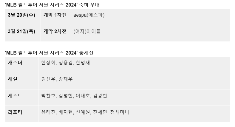 한편 축하 무대에는 걸그룹 aespa(에스파)와 (여자)아이들이 나선다. aespa(에스파)는 20일 다저스-샌디에이고의 개막 1차전, (여자)아이들은 21일 2차전에서 축하 공연을 펼친다.