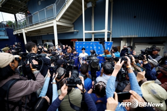 오타니 쇼헤이 취재를 위해 몰린 취재진.가운데 하얀색 셔츠가 오타니. /AFPBBNews=뉴스1