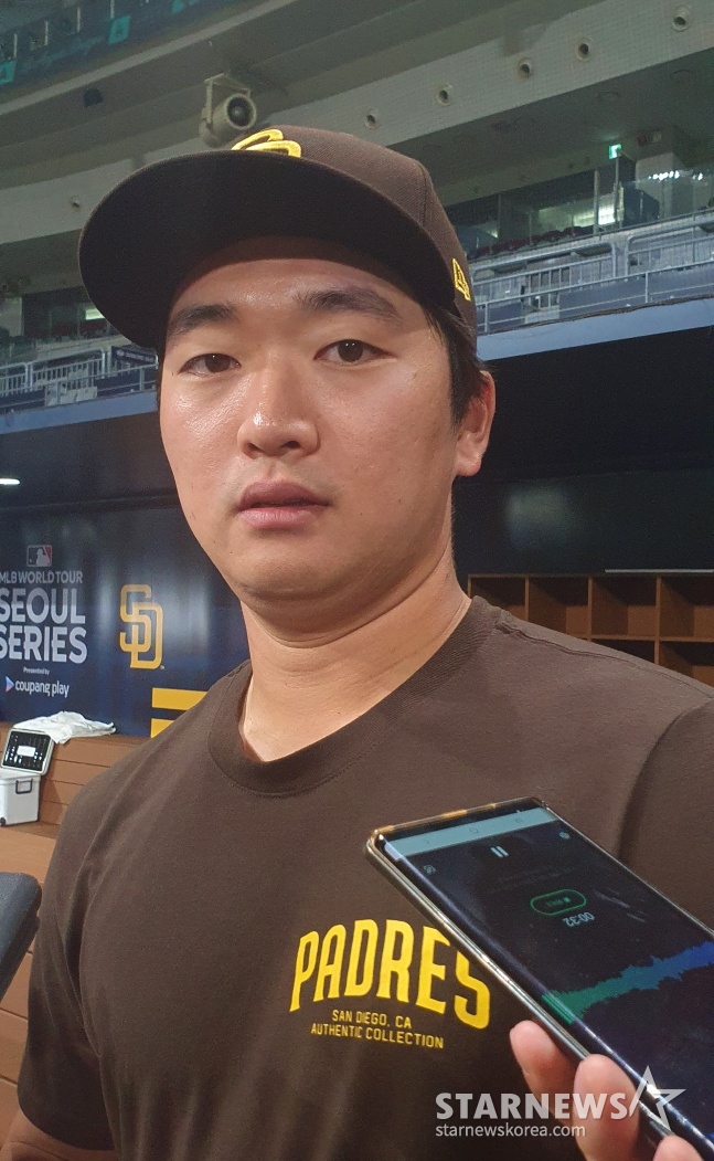 고우석은 16일 서울 고척스카이돔에서 열린 메이저리그 월드투어 '서울 시리즈 2024' 대비 첫 공개 훈련을 마치고 취재진과 인터뷰에 임했다. 예정된 시간보다 20분을 넘긴 시점에 나온 고우석의 얼굴에는 피곤한 기색이 역력했다. 그럴 법도 했다. 고우석과 샌디에이고 선수단은 지난 15일 새벽 2시 무렵 인천국제공항을 통해 한국에 입국했다. 고우석으로서는 지난달 9일 출국한 이후 약 한 달만의 귀국이었다.