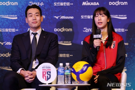 18일 도드람 2023~2024 V리그 포스트시즌 미디어데이가 열린 서울시 강남구 청담동 호텔 리베라 청담 3층 베르사이유홀. 봄 배구에 오른 여자부 세 팀의 감독과 대표 선수들이 마이크를 잡았다.