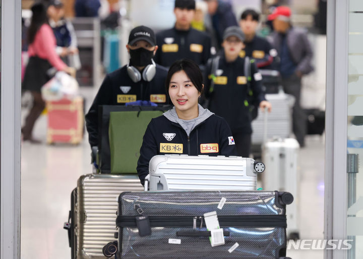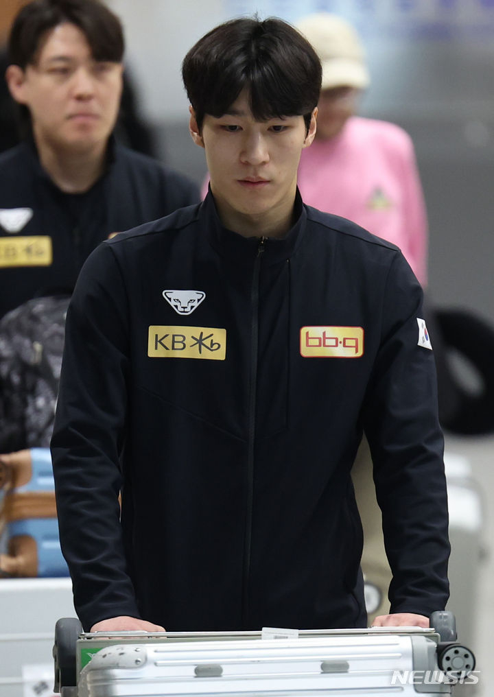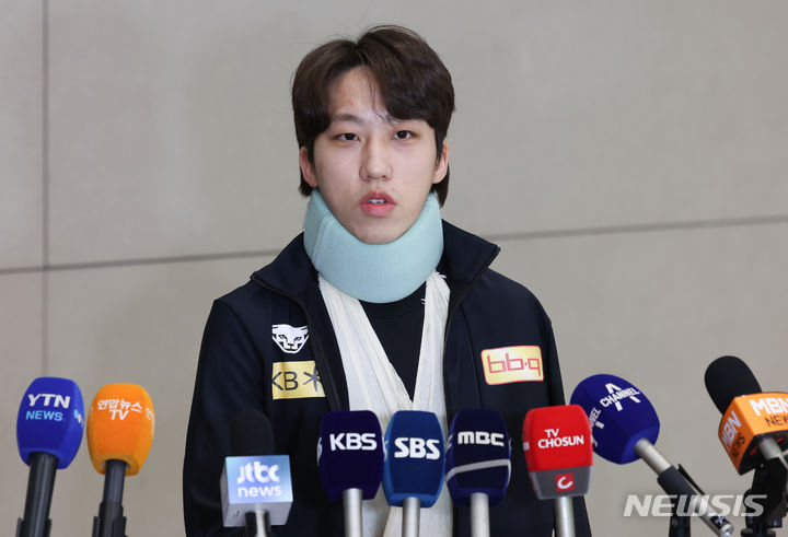 한국 쇼트트랙 대표팀은 19일 오후 인천국제공항을 통해 입국했다. 박지원, 황대헌, 김길리 등 대표팀 선수들이 모습을 드러냈다. 박지원은 목 보호대와 왼팔에 붕대에 감은 모습이었다.