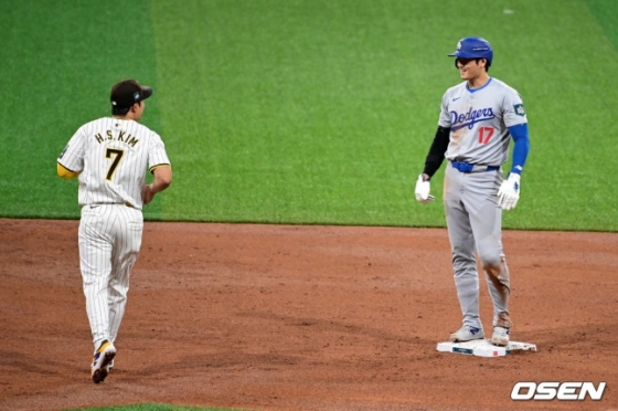 다음 타자는 프레디 프리먼이었다. 오타니는 초구에 과감하게 2루로 뛰며 여유 있게 도루를 성공시켰다. 올 시즌 오타니의 1호 도루였다. 그야말로 큰 키를 이용한 오타니의 빠른 주력이 돋보였다. 또 샌디에이고 포수 캄푸사노의 송구 약점을 간파한 오타니가 돋보인 순간이었다. 이어 다르빗슈가 볼넷을 허용하자 샌디에이고 코칭스태프가 마운드에 올랐다. 이때 오타니와 김하성이 2루에서 스쳐 지나가는 모습이 중계화면에 포착됐다. 순간, 오타니와 김하성이 서로 환하게 웃으며 대화를 나누는 모습이 잡혔는데, 입 모양으로 오타니가 '안녕하세요'라고 한국어로 또박또박 말하는 듯한 모습이었다.