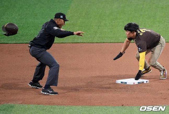 김하성은 전날(20일) 3타수 무안타 1볼넷에 이어 이날 안타를 추가하지 못했다. 하지만 2024년 정규시즌 첫 타점, 첫 도루를 기록하며 샌디에이고의 시즌 첫 승에 기여했다. 특히 한국 야구팬들 앞에서 전매특허나 다름없는 '헬멧 벗겨진 채 전력 질주'로 2루를 훔쳐 고척돔에 모인 홈팬들을 열광케 했다.
