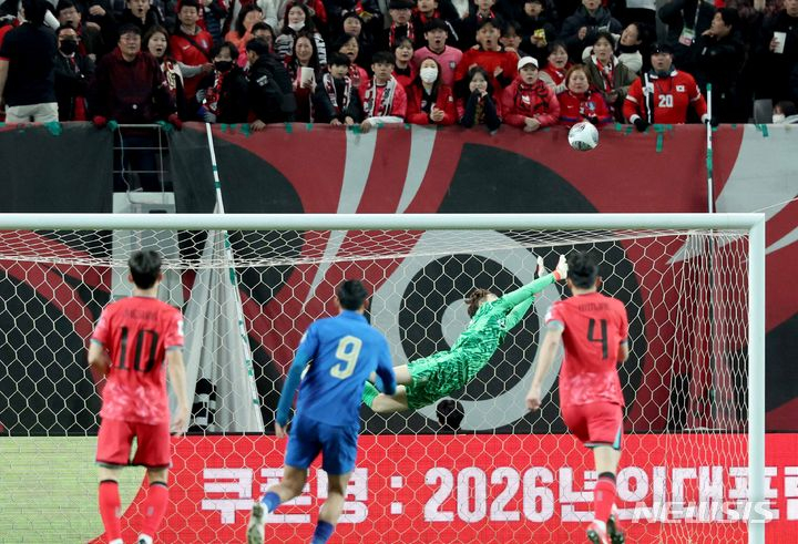 한국은 결정적인 기회를 놓쳤다. 19분 황인범이 시도한 중거리 슈팅이 골키퍼를 맞고 나왔고, 주민규가 빠르게 쇄도해 세컨드 볼을 노렸다. 공이 불규칙하게 튀어 정확한 슈팅으로 연결하지 못했다.