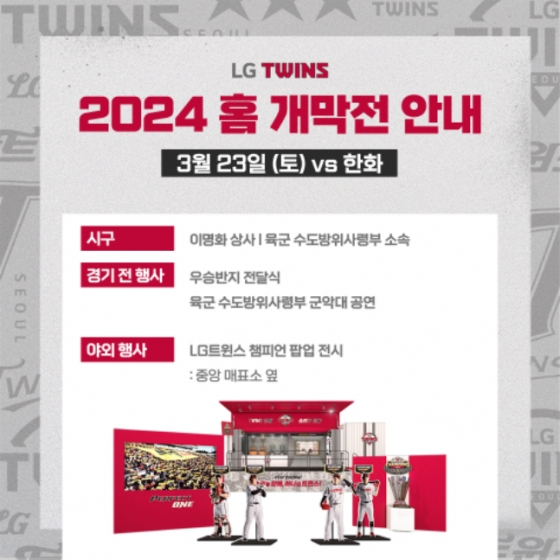 실제로 LG는 홈 개막전을 맞아 지난해 LG와 업무협약을 맺은 육군 수도방위사령부 군악대를 초대해 오프닝을 맡겼고, 2024시즌 선수단의 각오를 담은 출사표 영상 상영과 우승 반지 전달식을 진행한다. LG스포츠 김인석대표이사가 2023 통합우승을 기념해 제작한 우승 반지를 주장 오지환 선수에게 전달한다. 출사표 영상에는 2024시즌을 맞이하는 선수들의 각오와 팬들에 대한 메시지를 담았다. 또 개막일인 23일부터 4월 7일까지 잠실야구장 중앙매표소 옆 광장에서 1990년, 1994년 우승 트로피와 2023년 정규시즌 및 한국시리즈 우승 트로피와 롤렉스 시계, 아와모리 소주 등을 전시하는 'LG 트윈스 챔피언 팝업 전시'를 진행한다. 특히, 우승 반지를 최초 공개하고, 통합우승 하이라이트를 볼 수 있는 LED 영상월도 설치하여 팬들과 함께 감동의 순간을 되새긴다.