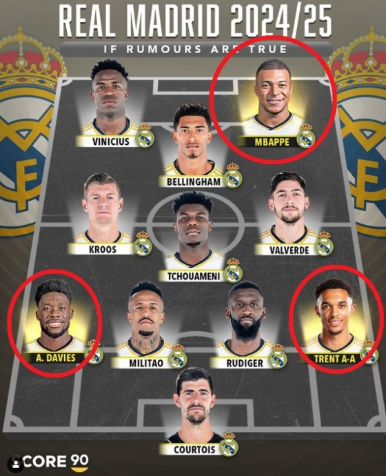 축구 전문 '스코어90'은 22일(한국시간) 공식 채널을 통해 "소문이 사실이라면 다음 시즌 레알의 베스트11은 정말 말도 안 되는 수준이다"라며 예상 라인업을 공개했다. 레알 이적설이 불거진 킬리안 음바페, 트렌트 알렉산더-아놀드, 알폰소 데이비스가 가세한 포메이션이다.