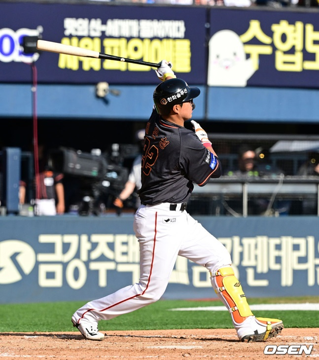 5회초 한화 타선이 분전했다. 채은성이 임찬규의 체인지업을 노려쳐 좌익수 방면 2루타, 문현빈이 속구를 공략해 좌전 안타를 날렸다. 하주석은 임찬규의 속구를 받아쳐 1타점 역전 적시타를 날렸다.