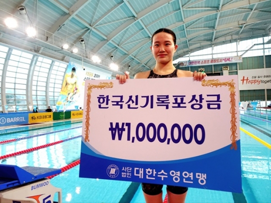 한편 한국 여자 수영 장거리 간판 한다경(24·전라북도체육회)은 자유형 800m 한국기록을 5년 만에 새로 썼다. 이날 열린 대회 여자 자유형 800m 결승에 나선 한다경은 8분38초32로 우승하며 새로운 한국기록을 수립했다.