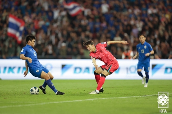 팽팽히 진행되던 경기는 한국의 선제골로 분위기가 확 달라졌다. 이재성(마인츠)이 문전으로 쇄도하다 조규성(미트윌란)의 슈팅을 침착하게 밀어 넣었다. 전반전 한국이 태국에 1-0으로 앞서고 있다.