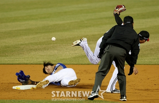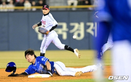 다음 타자는 8번 타자 김현준. 초구와 2구째 볼을 골라낸 뒤 3구째 스트라이크를 그냥 보냈다. 그리고 4구째를 던지는 순간, 류지혁이 2루 도루를 감행했다. 바깥쪽으로 빠지는 볼로 선언된 가운데, LG 포수 박동원이 공을 잡자마자 2루로 지체없이 뿌렸다. 송구 방향이 2루 베이스와 주자 류지혁 사이로 절묘하게 향했고, 자동 태그가 될 수 있는 타이밍으로 보였다. 그런데 공을 잡으려고 한 LG 유격수 오지환과 슬라이딩을 펼친 류지혁이 충돌하고 말았다. 태그를 시도한 오지환의 손과 류지혁의 몸이 닿았는데, 이후 류지혁은 베이스를 탄 채 넘어가고 말았다. 결과는 태그 아웃.