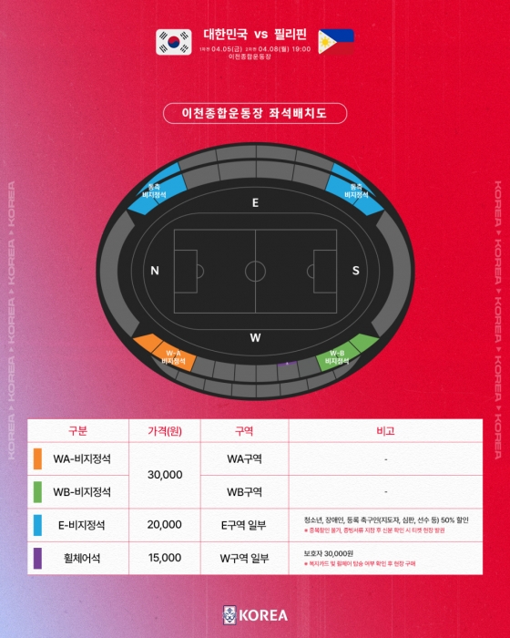 보도자료에 따르면 경기 티켓은 4월 1일 오후 7시부터 대한축구협회 마케팅 플랫폼 PLAYKFA에서 판매된다. 1, 2차전의 예매가 동시에 진행되며, 별도의 선예매는 없다. 경기 당일 경기장에서 현장구매도 가능하며 오후 4시부터 잔여 좌석분에 대해 구매할 수 있다.
