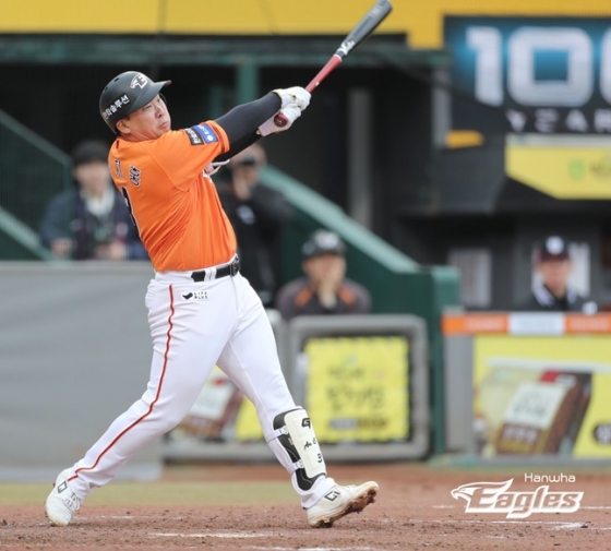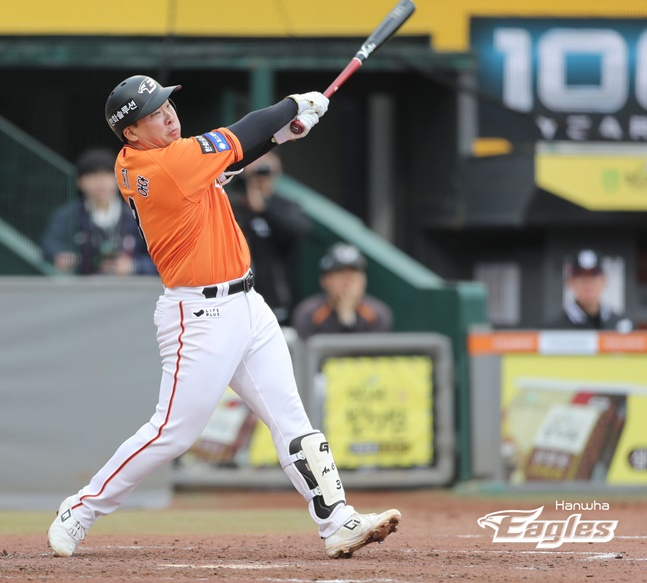 이후 채은성의 볼넷, 노시환의 1타점 2루타에 이어 안치홍까지 대포를 터뜨렸다. 1사 2루에서 엄상백의 시속 143㎞ 높은 속구를 잡아당겨 좌측 담장을 넘기는 투런 홈런을 작렬했다.