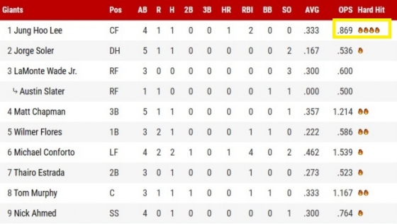 빅이닝으로 다시 돌아온 8회초 마지막 타석은 땅볼로 물러났지만, 이마저도 시속 97.1마일(약 156.2㎞)의 강한 타구였다. 꾸준하게 정타를 생산하는 이정후에 힘입어 샌프란시스코는 개막 3경기 만에 지난해와 확 달라진 모습을 보여주는 중이다. NBC 스포츠 에어리어에 따르면 지난해 샌프란시스코 타자들이 한 경기 시속 95마일 이상의 정타를 17회 기록한 건 두 차례에 불과했다. 하지만 30일 경기에서 한 차례 기록했고 이날 경기에서도 14개의 정타를 생산했다.