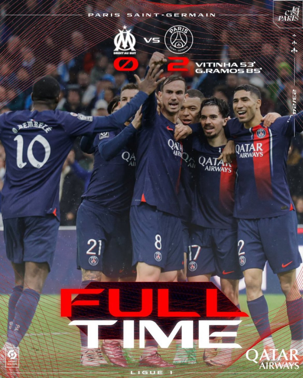 파리 생제르망은 1일(한국시간) 프랑스 마르세유의 스타드 벨로드롬에서 열린 2023~2024시즌 프랑스 리그1 27라운드에서 마르세유에 2-0으로 이겼다. 이날 결과로 파리 생제르망은 27경기 18승 8무 1패 승점 62로 2위 브레스트(27경기 14승 8무 5패 승점 50)와 격차를 12점 차로 벌렸다. 마르세유는 27경기 10승 9무 8패 승점 39로 7위에 머물렀다.