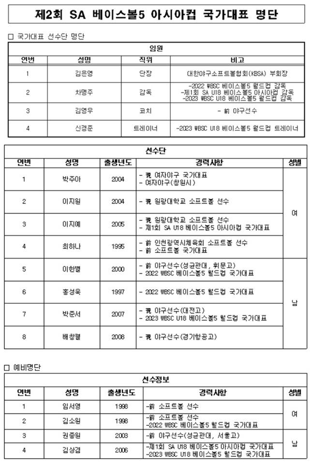협회는 월드컵 출전권 획득이라는 목표 아래 2022 WBSC 베이스볼5 월드컵 대표팀 감독을 역임한 차명주(51) 감독을 대표팀 수장으로 선임하고, 1·2차 국가대표 선발전을 통해 남자(이한별, 홍성욱, 박준서, 배창렬), 여자(최하나, 이지원, 박주아, 이지예) 각각 4명씩 8명의 선수와 4명의 예비 선수도 함께 선발했다.
