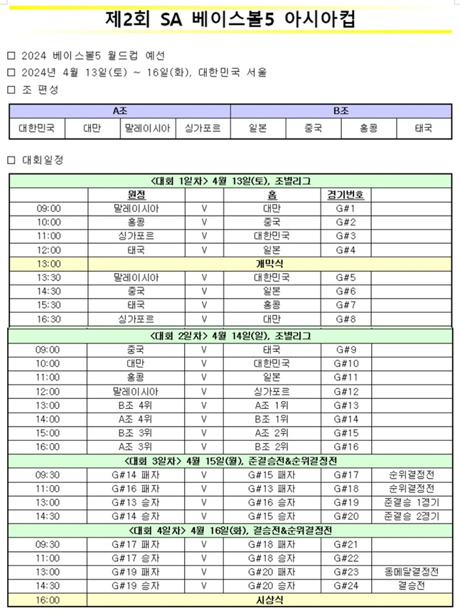 대한야구소프트볼협회(KBSA·회장 이종훈)는 오는 13일부터 16일까지 서울 송파구 올림픽공원 평화의 광장 베이스볼5 특설경기장에서 '제2회 SA 베이스볼5 아시아컵'을 개최한다고 2일 밝혔다.