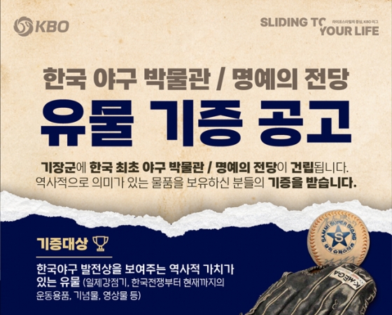 KBO는 "2026년 완공 예정인 기장 야구박물관, 명예의 전당을 야구인, 팬들과 함께 만들어가기 위해 야구 유물을 기증받는다"고 2일 밝혔다.