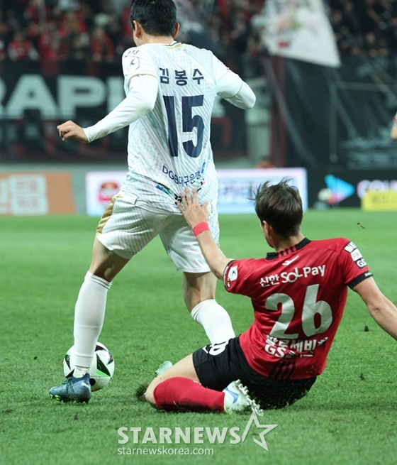 김천이 바로 반격했다. 전반 4분 김천의 역습 상황에서 김민준의 드리블 돌파를 막던 권완규가 거친 태클로 경고를 받았다. 이어진 공격 상황에서 김진규가 중거리슛을 때렸지만 바운드 돼 골문 오른편으로 벗어났다.