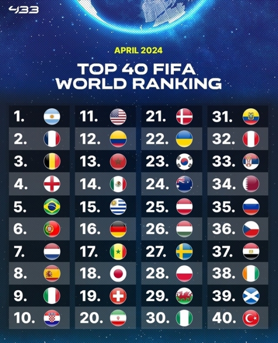 '축구의 신' 리오넬 메시(인터 마이애미)의 아르헨티나는 1위, 프랑스는 2위, 벨기에는 3위에 자리했다. 4위는 잉글랜드, 5위는 브라질, 6위는 포르투갈이다. 7위 네덜란드, 8위 스페인, 9위 이탈리아, 10위 크로아티아도 톱10에 들었다.