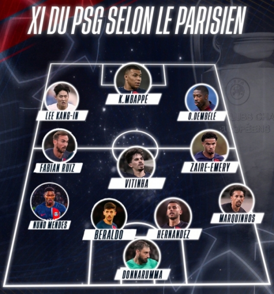 프랑스 현지에서도 이강인의 선발을 예상하는 분위기다. 지난 7일 프랑스 '르 파리지엥'은 4-3-3 포메이션에서 이강인과 킬리안 음바페, 우스만 뎀벨레가 최전방 스리톱을 구성하고 중원에 파비안 루이스, 비티냐, 워렌 자이르-에메리가 나설 것으로 예상했다. 포백은 누누 멘데스, 루카스 베랄두, 뤼카 에르난데스, 마르퀴뇨스, 골키퍼는 잔루이지 돈나룸마가 출격할 것으로 예상했다.