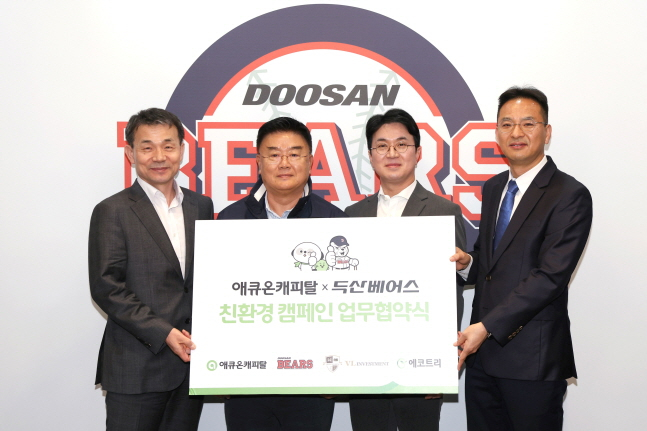 이날 협약식에는 김태룡 두산 베어스 단장과 이중무 애큐온캐피탈 대표이사를 비롯해 환경·에너지 분야 전문 투자 파트너 박영준 VL인베스트먼트 대표, 재활용 폐기물 수거 업체 신정훈 에코트리 대표가 함께 했다.