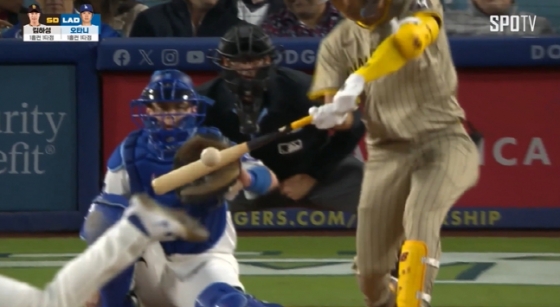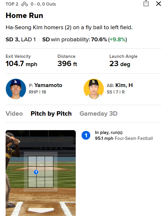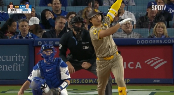4회초 1사 1루에서 타석에 선 김하성은 볼카운트 1-1에서 야마모토의 낙차 큰 커브에 타이밍을 맞추지 못했다. 힘 없이 솟은 타구는 1루수 프리먼의 미트로 빨려들어갔다.