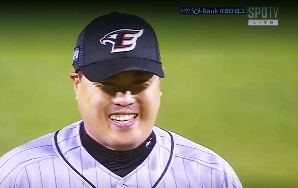 그리고 2구째. 류현진이 포수 최재훈의 사인에 고개를 저었다. 한 번, 두 번, 그리고 세 번. 이번에는 빠른 볼일까. 아니었다. 이번에도 폭포수 커브(116km)가 다시 한번 포물선을 그리며 몸쪽 낮은 코스로 파고들었다. 양의지는 이번에는 기다리지 않고 배트를 힘차게 휘둘렀으나 빗맞으면서 파울이 됐다. 바로 이 순간, 양의지는 류현진을 쳐다보며 이른바 '식빵'을 구웠고, 그런 모습을 본 류현진은 크게 웃었다. 그야말로 자신이 수 싸움에서 완벽하게 이겼다는 듯이….