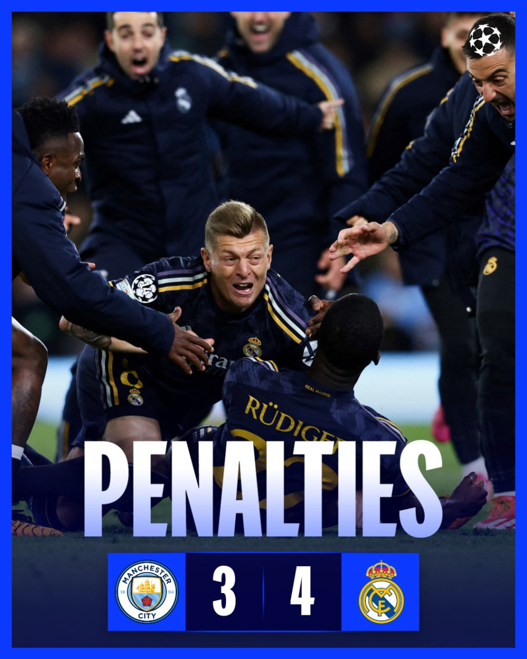 맨시티와 레알 마드리드는 올 시즌 챔피언스리그 8강 경기 중 가장 치열한 맞대결이었다. 1차전을 3-3으로 비긴 데 이어 2차전에서는 정규 시간 안에 승부를 가리지 못했다.