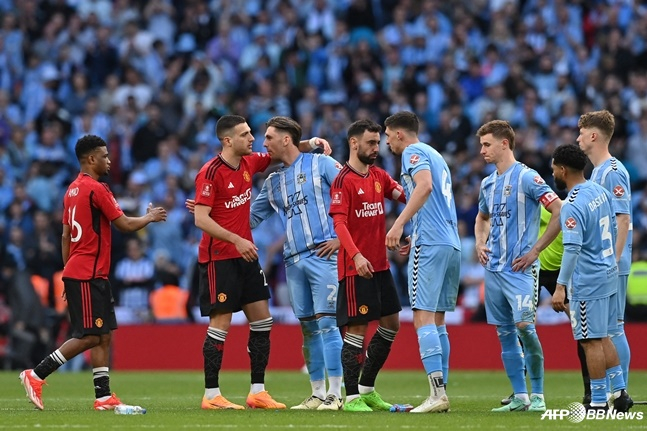 맨유는 21일 영국 웸블리 스타디움에서 열린 2023~2024시즌 잉글랜드축구협회(FA)컵 준결승에서 코번트리(2부)와 경기에서 승부차기(3-3, PSO 2-4) 끝에 간신히 승리했다.