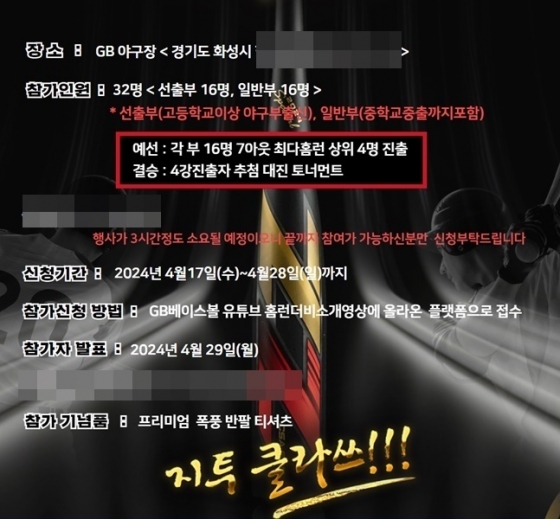 참가 신청은 오는 28일까지 GB베이스볼 유튜브 홈런더비 소개 영상에 올라온 플랫폼을 통해 가능하다. 최종 참가자는 오는 29일 발표될 예정이다.
