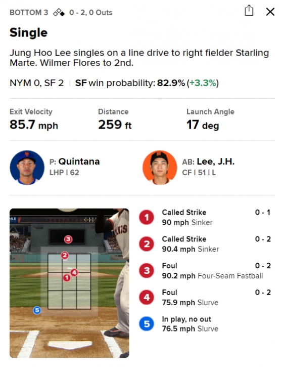 좌투수를 상대로도 타율 0.276을 기록 중인 이정후는 이날 3번 타자로 출전했다. 첫 타석 2사 주자 없는 가운데 타석에 선 이정후는 통산 93승에 빛나는 상대 선발 호세 퀸타나를 상대로 높은 싱커를 때렸으나 1루수 땅볼로 물러났다.