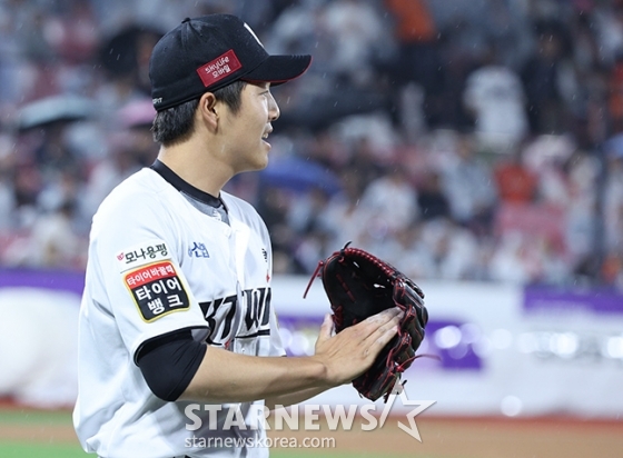 kt 선발 육청명이 5회 투구를 마친 후 더그아웃으로 향하며 호수비를 펼친 야수들에게 감사함을 표시하고 있다.