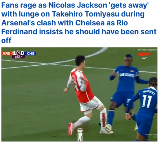 영국 '데일리 메일'은 24일(한국시간) "아스널과 첼시의 경기 중 니콜라 잭슨(23·첼시)은 도미야스를 의도적으로 짓밟고 도망갔다. 이를 본 팬들이 분노하고 있다"라고 보도했다.