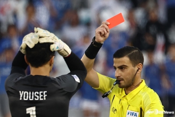변수가 생겼다. 전반 42분 만에 카타르 골키퍼 유세프 압둘라가 퇴장당했다. 상대 공격수의 가슴팍으로 발을 뻗은 것이 확인됐다. 주심은 온 필드 리뷰를 약 3분간 지켜본 끝에 레드카드를 꺼내 들었다. 유세프는 억울해하며 경기장을 떠났다. 카타르는 골키퍼 투입을 위해 43분 만에 예기치 못한 교체카드를 꺼냈다. 전반전은 1-1로 끝났다.