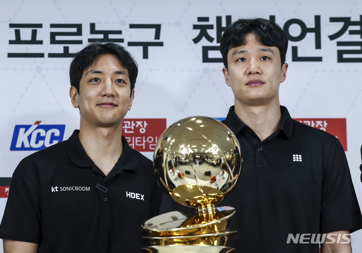 '2023~2024 정관장 프로농구 챔피언결정전 미디어데이'가 25일 오전 서울 강남구 KBL센터에서 열렸다. 부산 KCC 전창진 감독과 선수 대표로 허웅, 송교창이 참석했다. 수원 KT는 송영진 감독과 허훈, 문성곤이 자리했다.