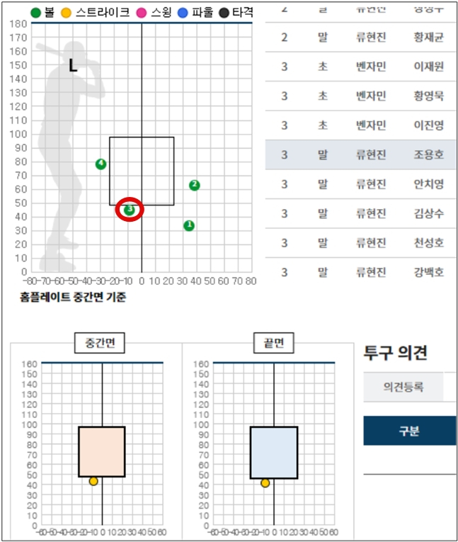 그리고 4구째. 이번엔 몸쪽 공(135km 속구)이 또 살짝 보더라인에 걸치지 않으면서 볼넷이 됐다. 1회와 2회를 산뜻하게 출발했던 류현진이 3회 선두타자에 스트레이트 볼넷을 내준 건 '제구의 신' 류현진에게 있어 퍽 이례적인 상황이었다.