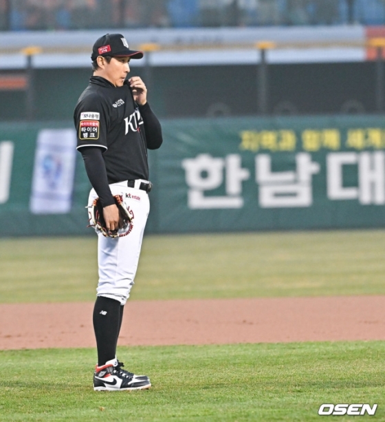 2구째 속구(144km)는 바깥쪽 낮은 코스에서 벗어난 볼. 이번에도 사각형 모서리 구석을 절묘하게 찔렀으나 살짝 벗어났다. 이어 3구째. 오원석의 몸쪽 속구(143km)가 몸쪽 보더라인에 살짝 걸치면서 스트라이크가 선언됐다. 황재균이 순간 움찔할 정도로 몸쪽 깊숙하게 제구가 잘 됐다. 황재균은 잠시 타석을 벗어나며 숨을 골랐다.