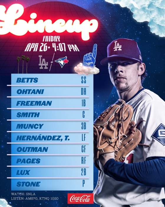 다저스 선발 스톤은 7이닝 동안 94구를 던져 2피안타(1피홈런) 2볼넷 2탈삼진 1실점 호투하며 시즌 2승(1패) 째를 챙겼다. 토론토 배싯은 2⅔이닝 동안 77구를 던져 9피안타(2피홈런) 3볼넷 4탈삼진 7실점하며 4패(2승) 째를 떠안았다.
