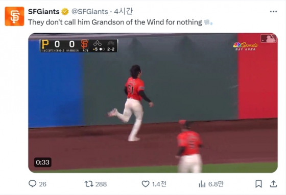 이에 샌프란시스코 구단은 공식 SNS에 이정후의 수비 장면을 올린 뒤 "괜히 그(이정후)를 바람의 손자라고 부르는 게 아니다(They don't call him Grandson of the Wind for nothing)"며 감탄했다.