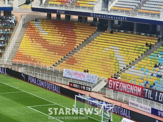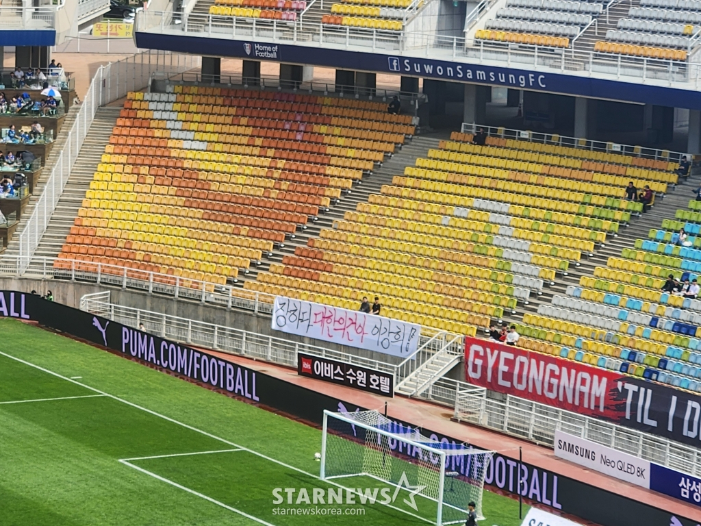 경남 서포터들도 소속팀 유망주의 아픔을 보듬어줬다. 원정팬들은 '장하다 대한의 건아 이강희'라는 현수막을 걸고 응원을 펼치고 있다.