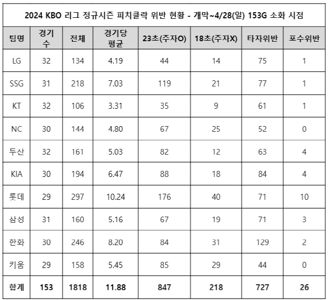 한국야구위원회(KBO)는 29일 올 시즌 피치클록 위반 현황을 발표했다. 28일까지 2024시즌 전체 153경기 중에서 피치클락 위반은 총 1818건이 나왔다.