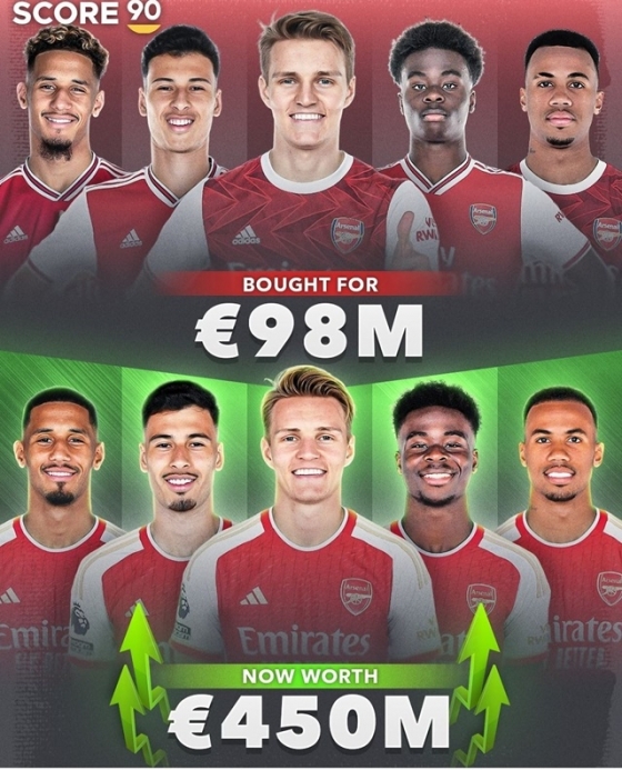 축구전문 스코어90은 29일(한국시간) 아스널 소속 5명 선수들의 몸값 변화에 대해 소개했다. 주인공은 '캡틴' 마르틴 외데가르드를 중심으로 가브리엘 마르티넬리, 부카요 사카, 윌리엄 살리바, 가브리엘 마갈량이스. 아스널이 이 5명을 처음 샀을 때 몸값은 총 9800만 유로(약 1140억 원)였는데, 현재 이들의 몸값은 4억 5000만 유로(약 6700억 원)가 됐다. 무려 6배 넘게 뛴 것이다. 사카의 경우 아스널 유스 출신으로 엄청난 복덩이인 셈이다.